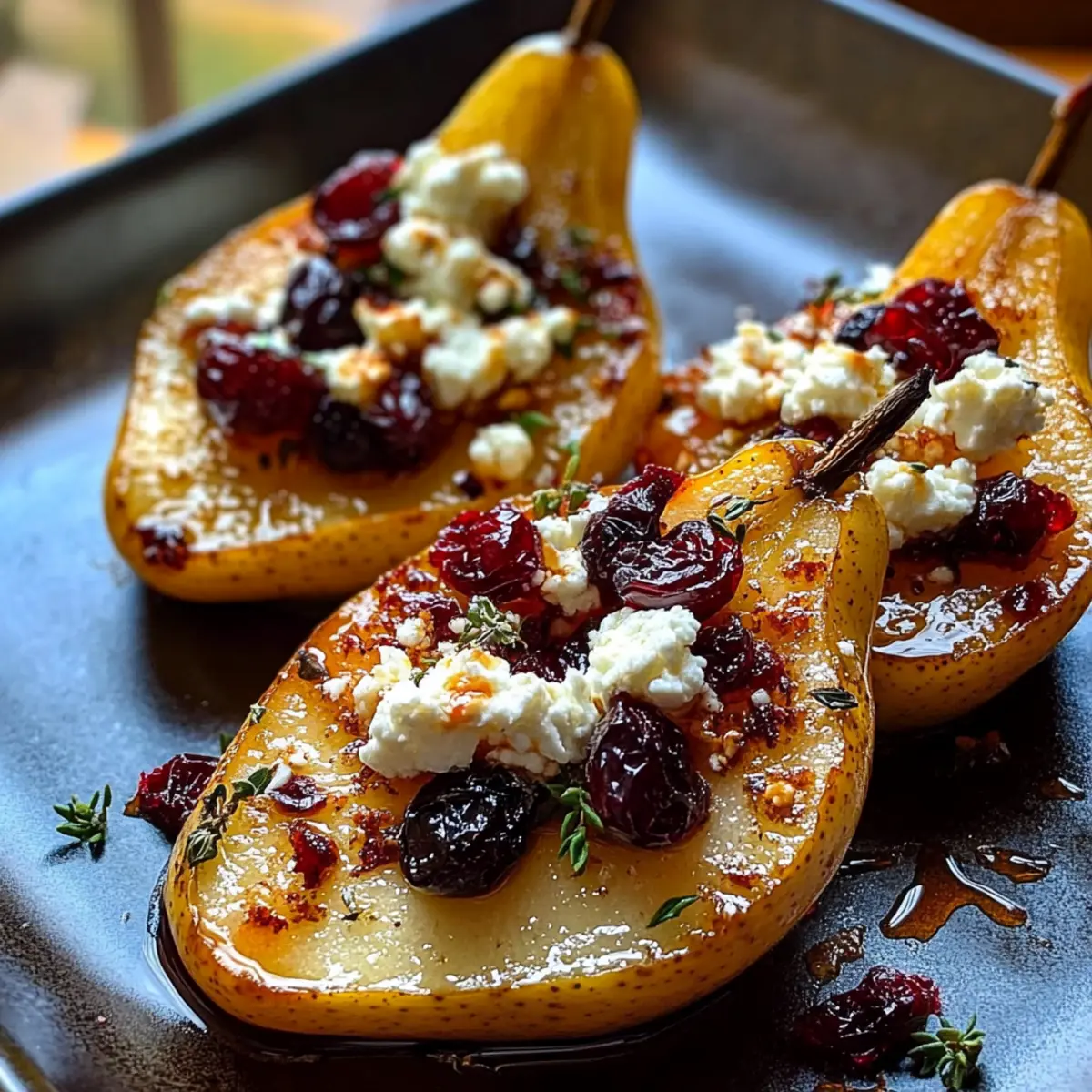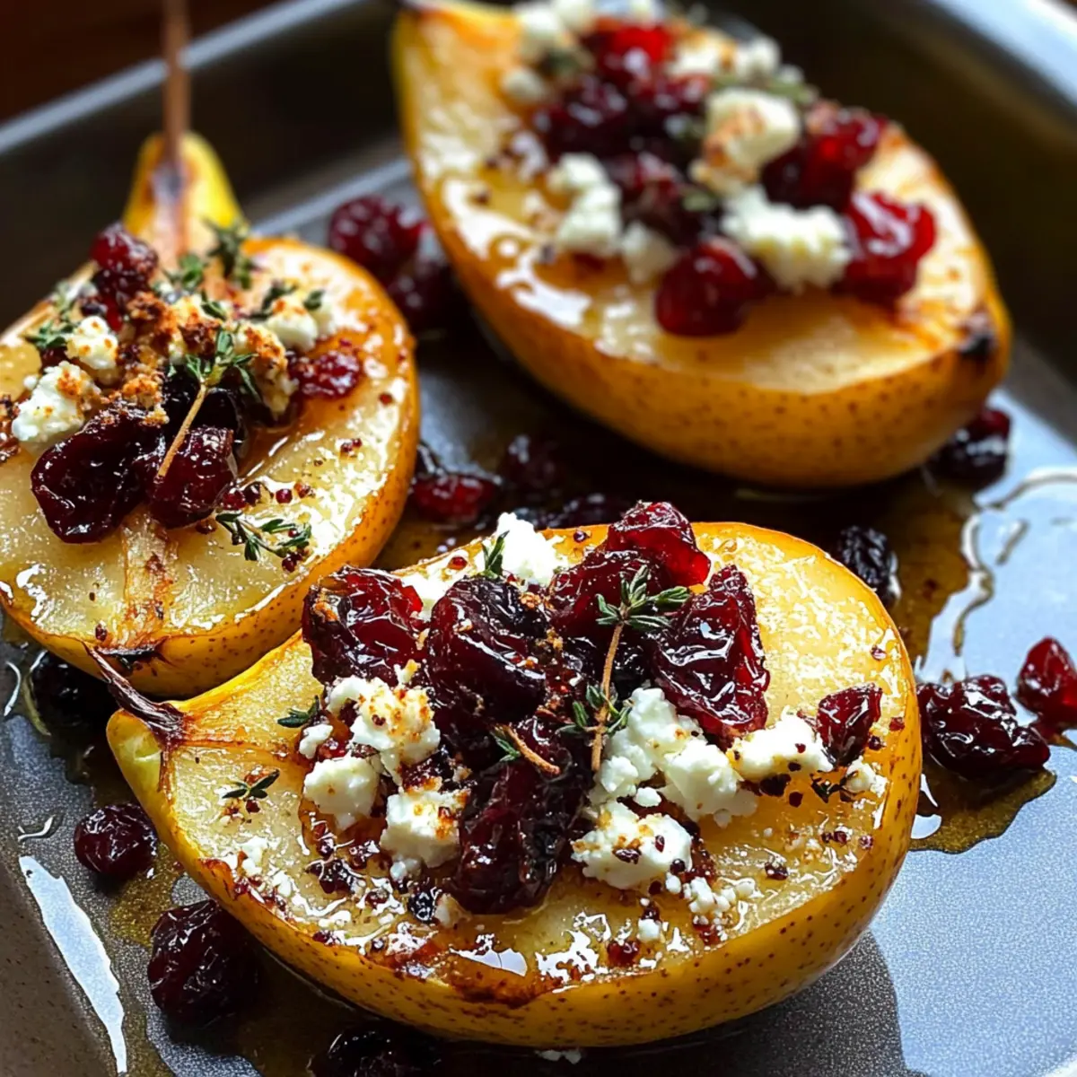- Remove from oven, add crumbled feta and dried cranberries on top of each pear half.