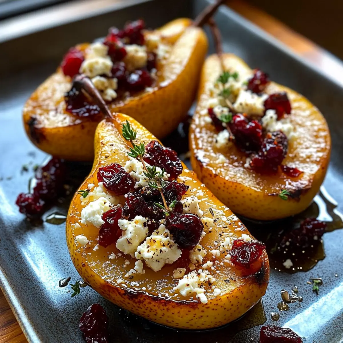 Once the pears are perfectly baked, remove the dish from the oven and immediately add crumbled feta cheese generously on top of each pear half, followed by a sprinkle of dried cranberries. The heat from the pears will slightly soften the feta, creating a luscious texture that blends beautifully with the sweet and tangy flavors.