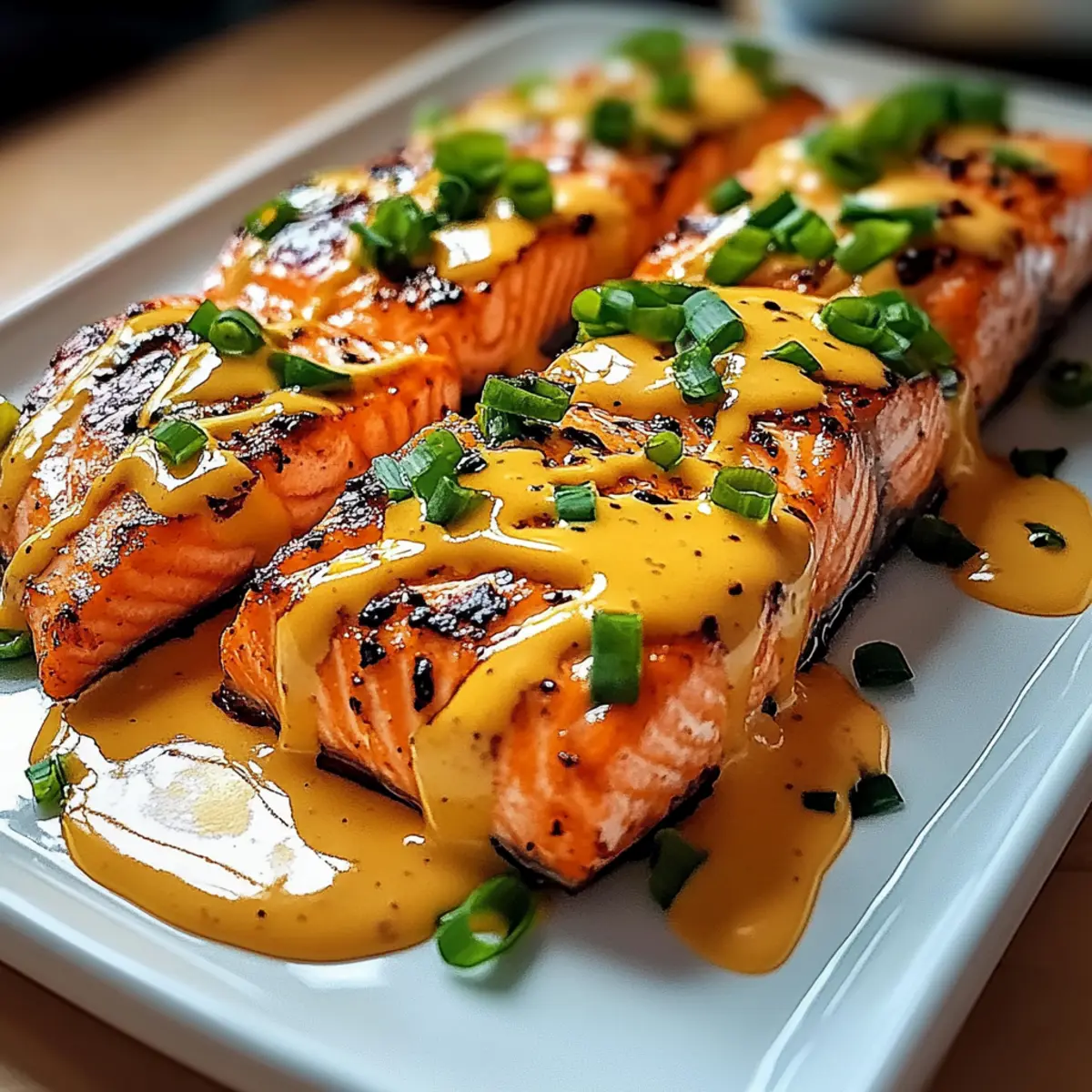 - Remove the salmon from heat, rest for 1 minute, drizzle with Bang Bang sauce, and serve.