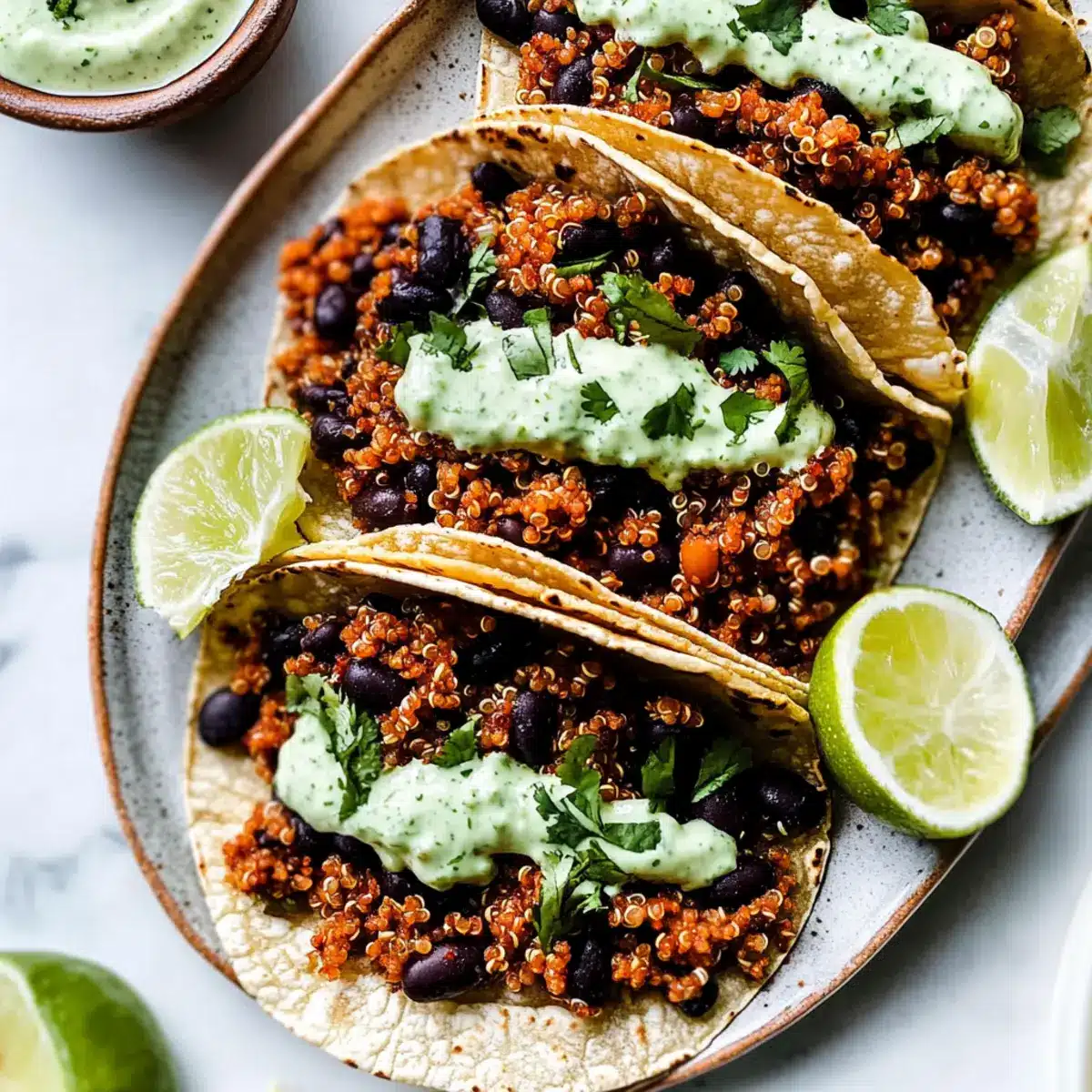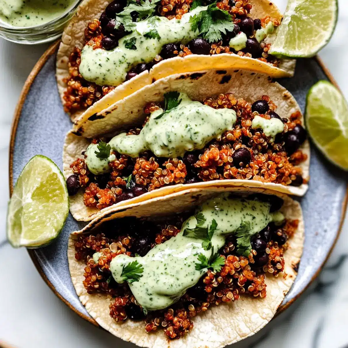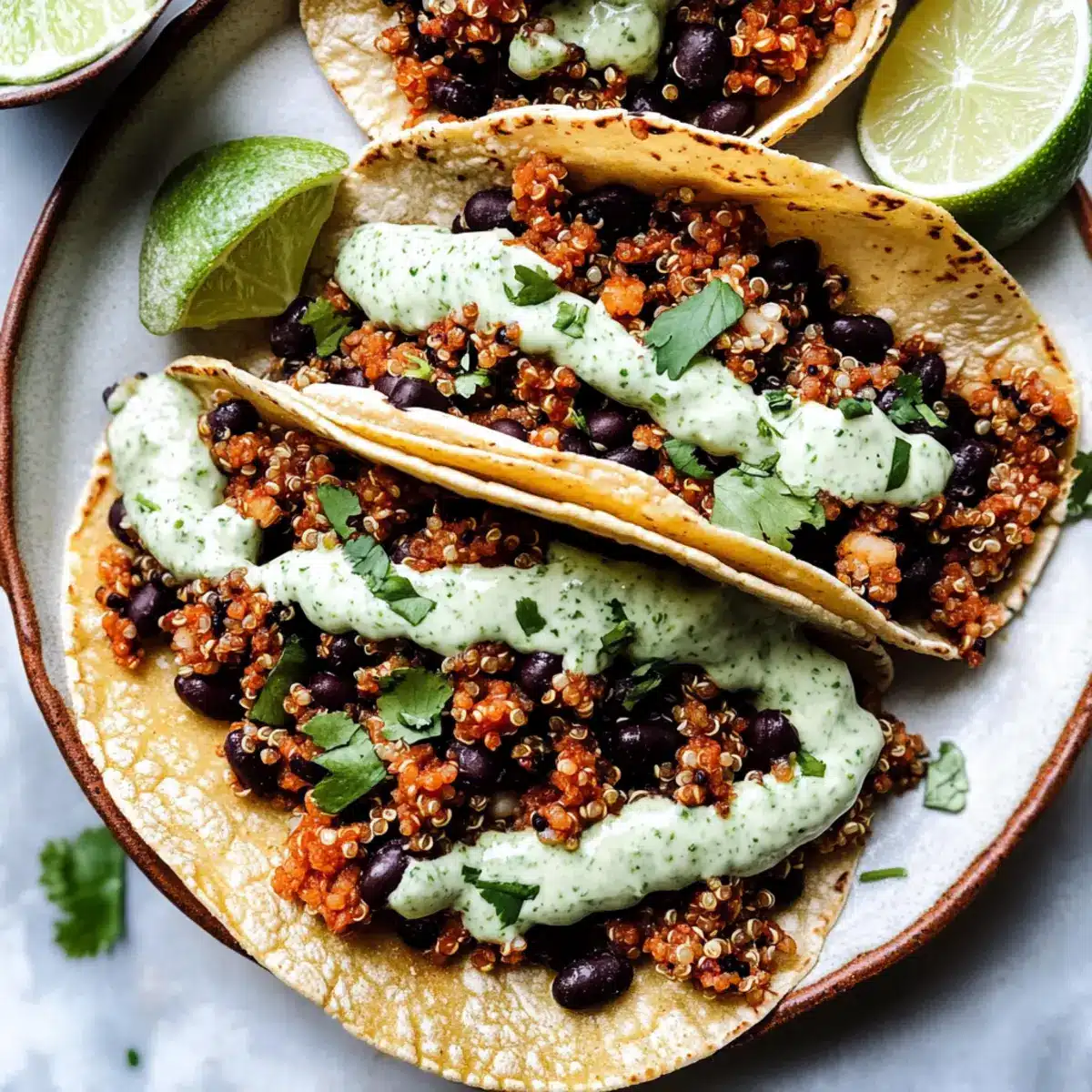 Warm your tortillas in a dry skillet over low heat for about 30 seconds per side until pliable. Then, generously spoon the quinoa and black bean mixture onto each tortilla and top with Cilantro Lime Crema. Feel free to add fresh cilantro or other favorite toppings to elevate your Black Bean Quinoa Tacos.