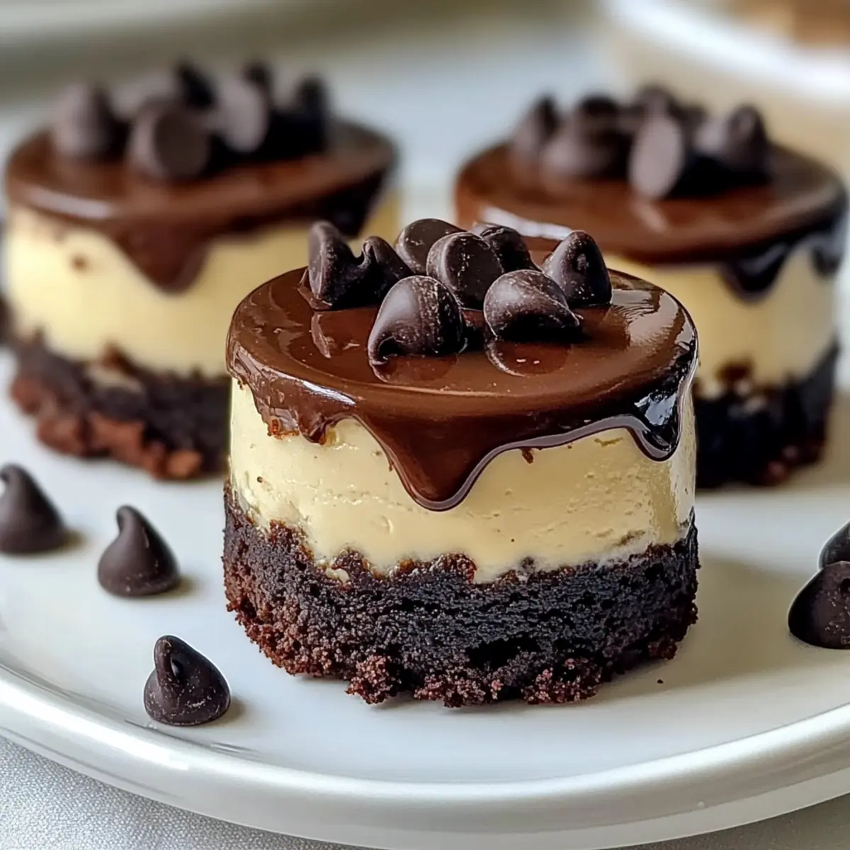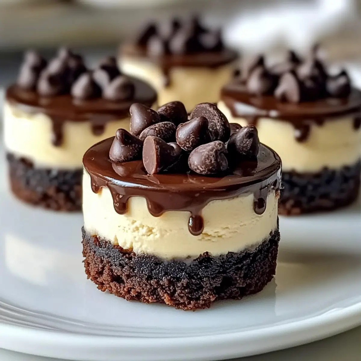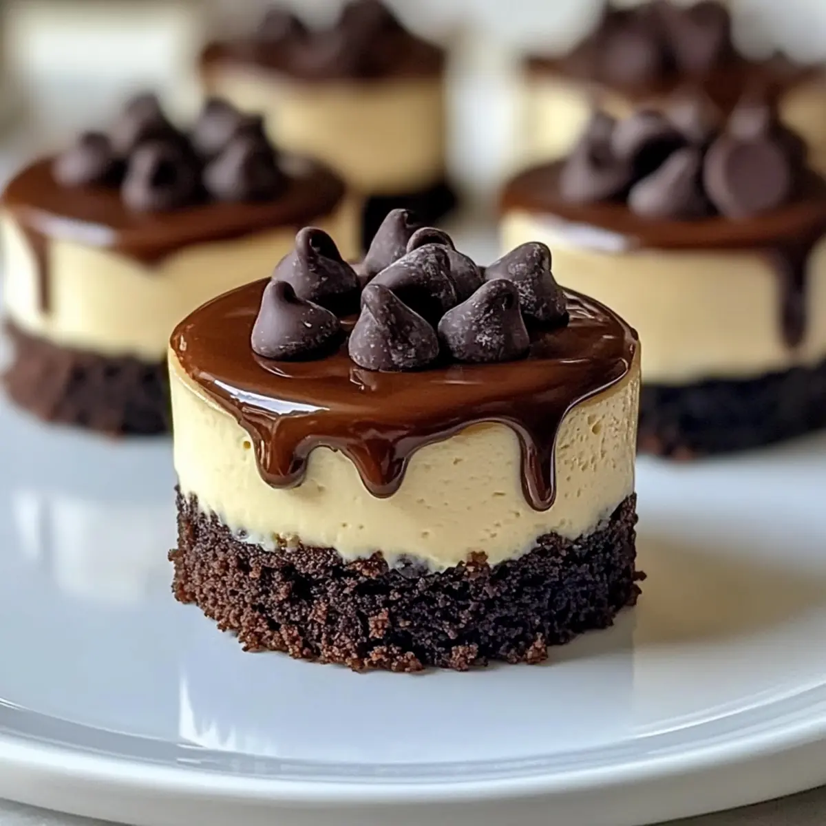 Once the mini cheesecakes have chilled for at least 2 hours, spoon the rich ganache over the top of each cheesecake, allowing it to drizzle down the sides. Finish with a sprinkle of mini chocolate chips for added texture and visual appeal. Your Brownie Bottom Mini Cheesecakes are now ready to impress!