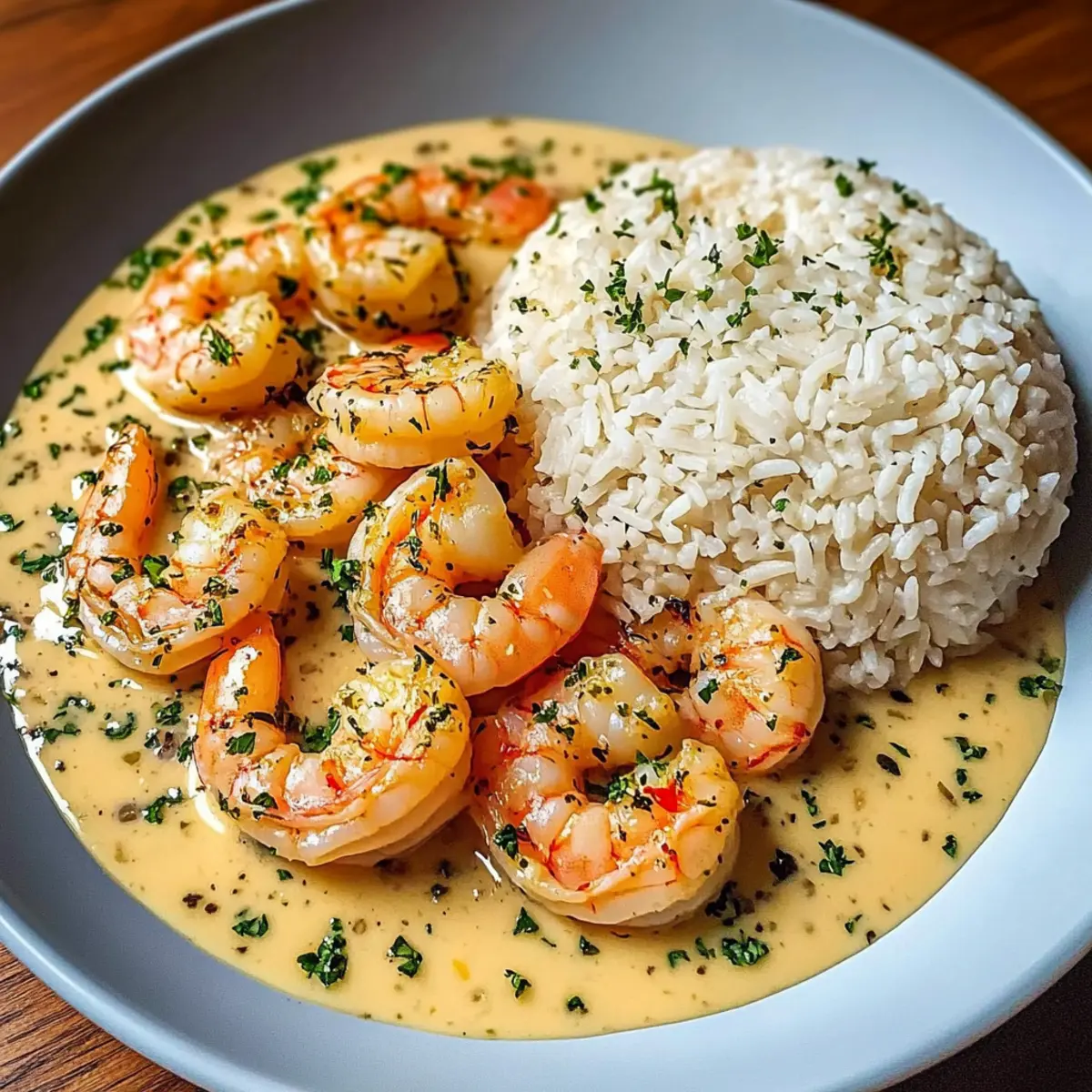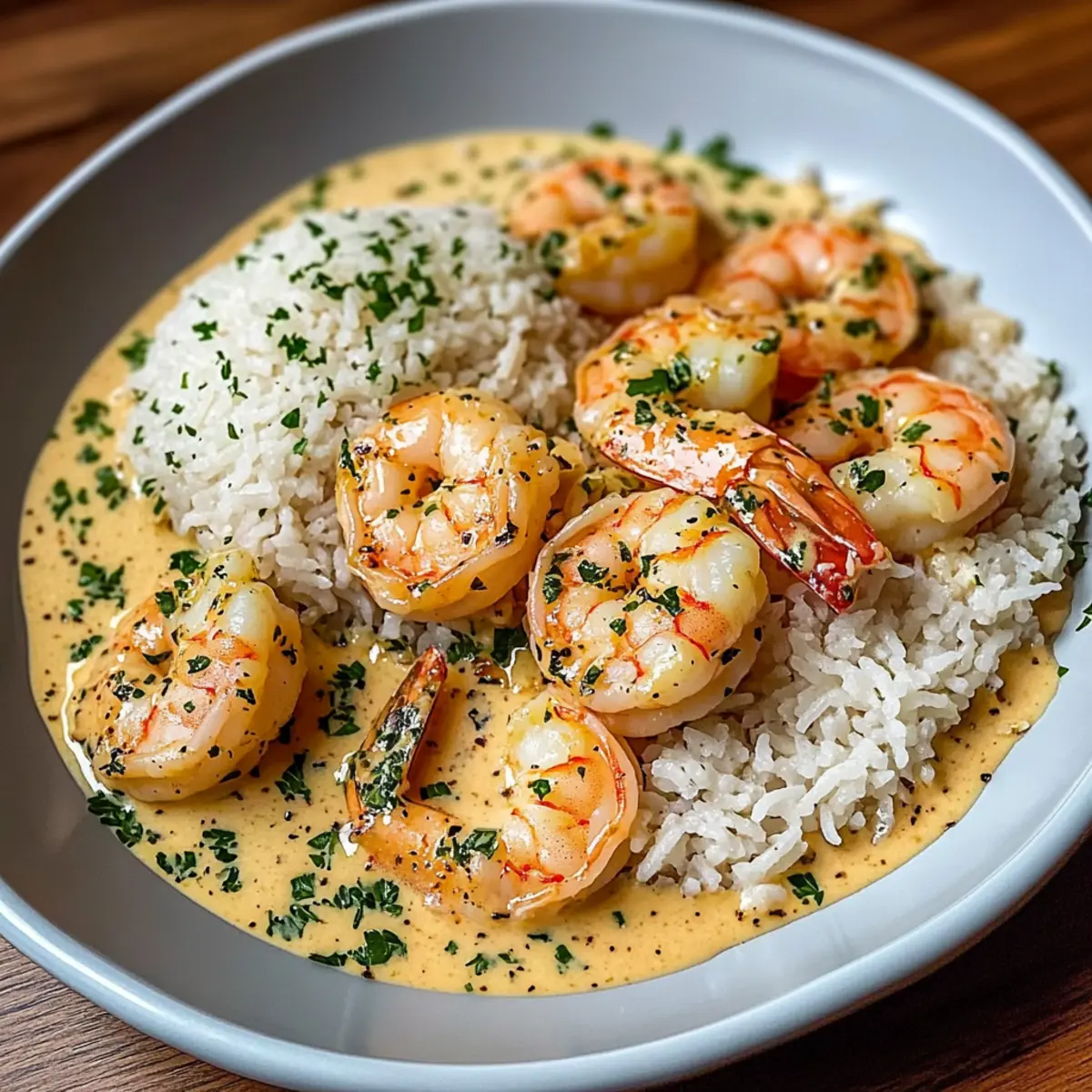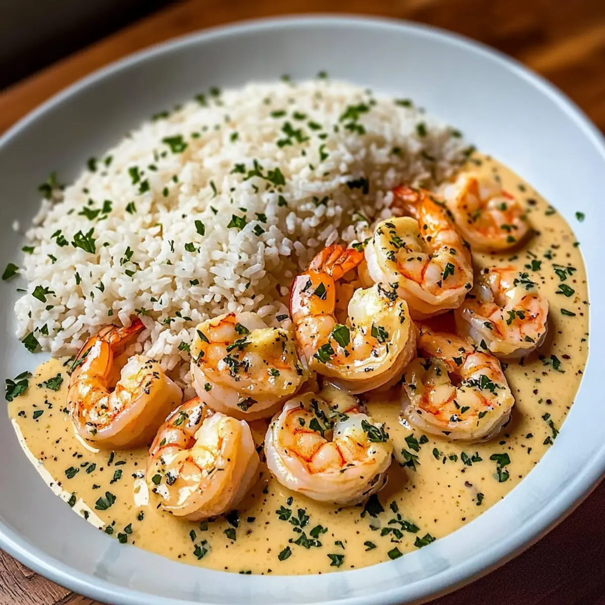 - Spoon rice onto plates, top with shrimp and creamy sauce, and garnish with chopped parsley or lemon zest.