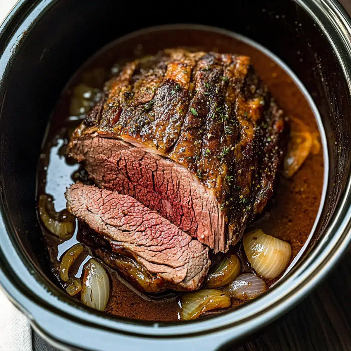 Melt-in-your-mouth perfection: Tender slow-cooked beef roast transforms into a flavor-packed masterpiece, ideal for cozy nights.