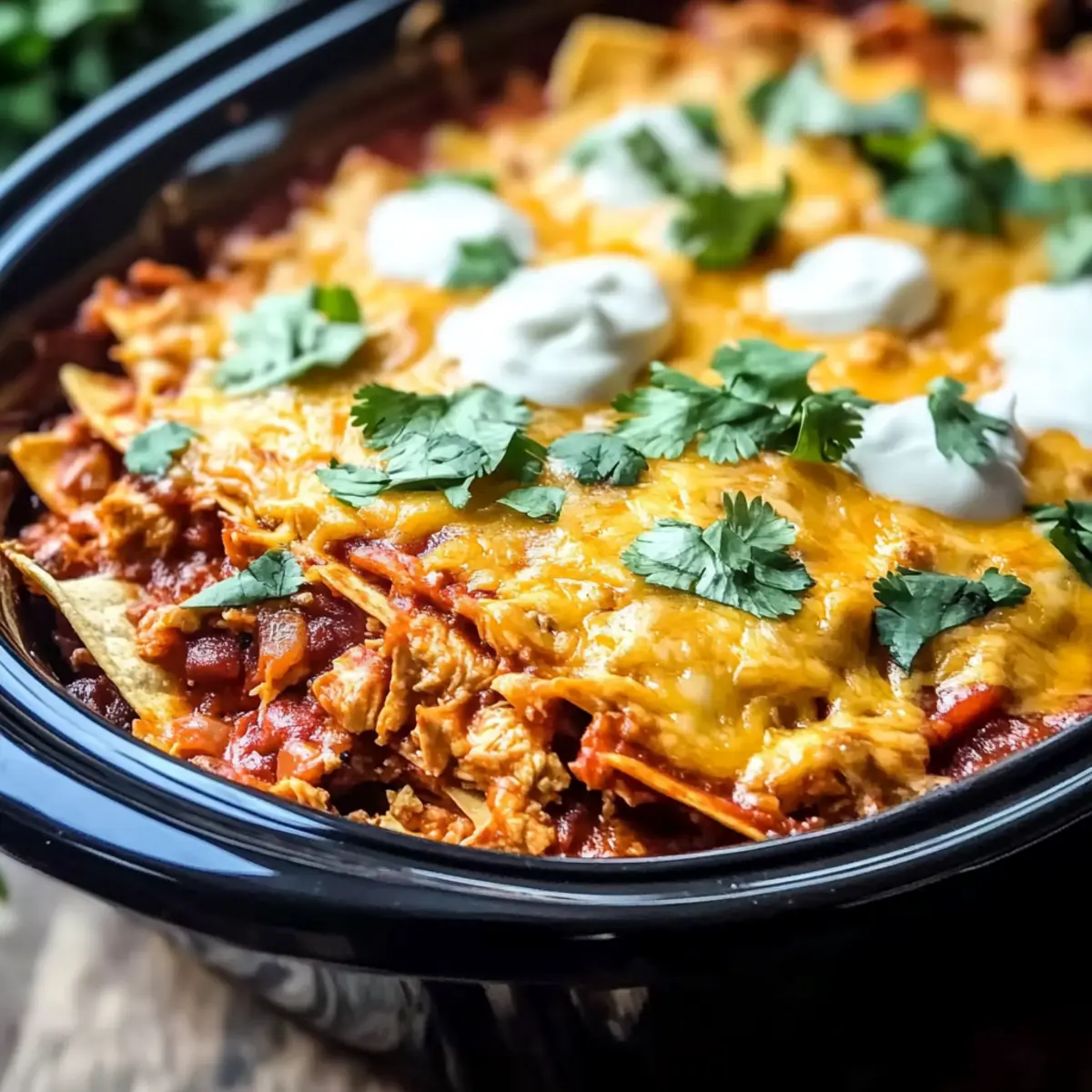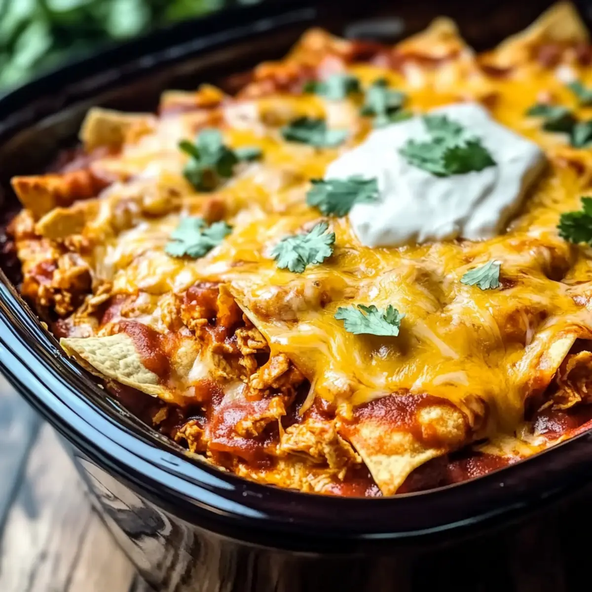 Once done cooking, let the casserole sit for about 5 minutes to settle. Garnish generously with fresh cilantro and a dollop of sour cream for a burst of freshness. Serve your Crockpot Chicken Enchilada Casserole alongside a crisp salad or creamy avocado for an irresistible meal everyone will love!
