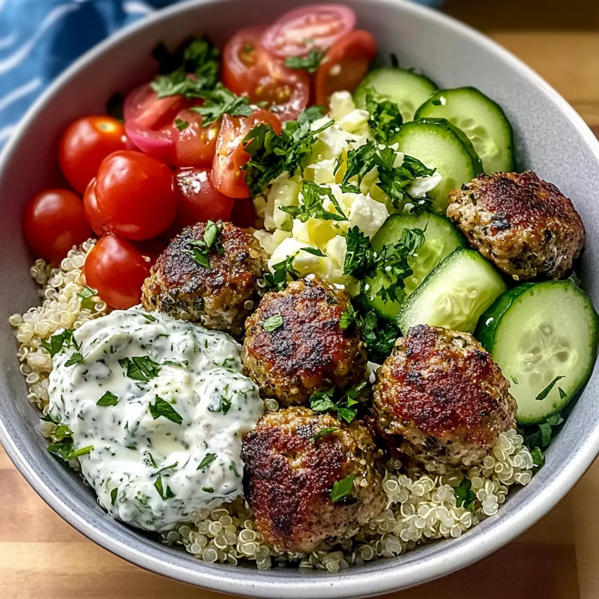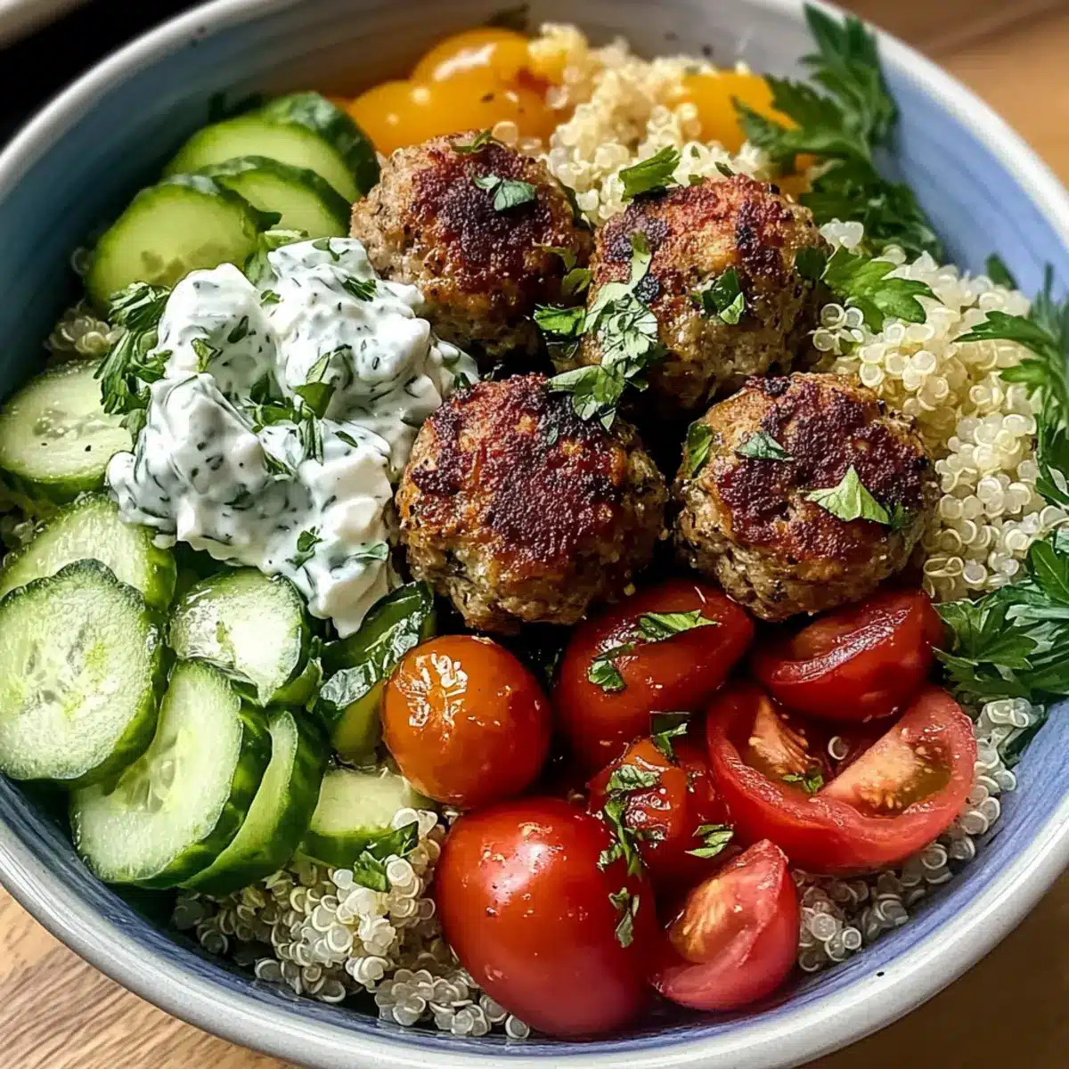 - Assemble the bowls with a base of quinoa or rice, followed by the cucumber, cherry tomatoes, red onion, and meatballs.