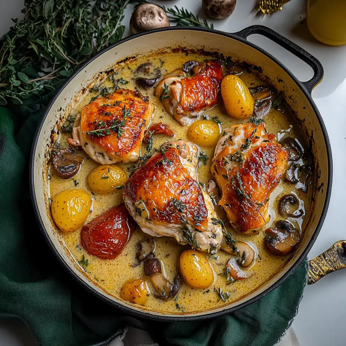 Simplicity Meets Indulgence: The Herb Roasted Chicken in Creamy White Wine Sauce is effortlessly simple, requiring just one pan for easy cleanup.
