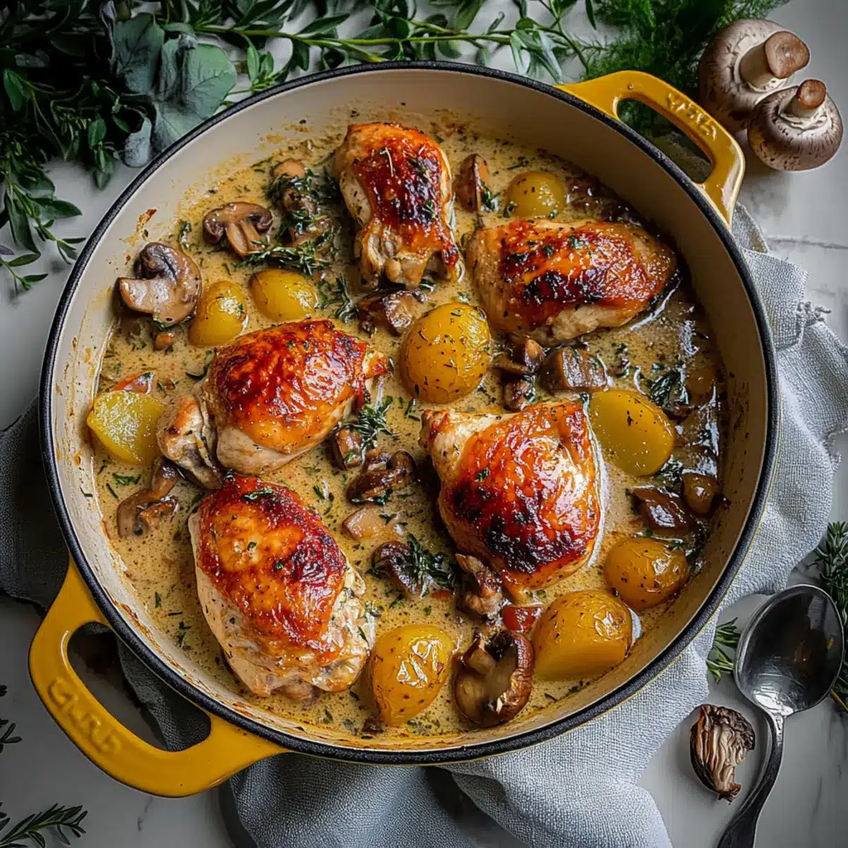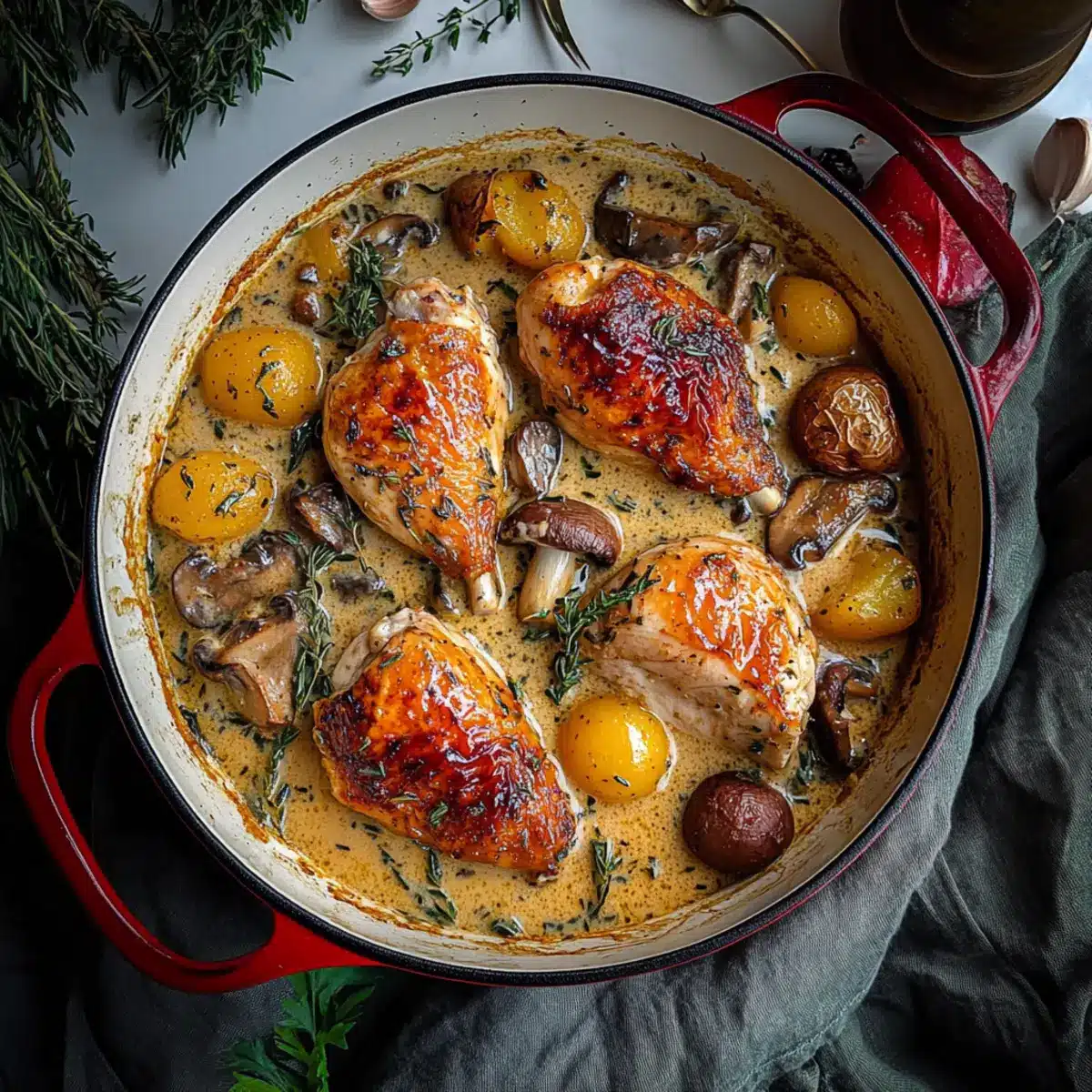 Once the chicken is done roasting, carefully remove the pot from the oven and stir in 1 cup of cream until fully combined. This adds a luxurious creaminess to the sauce, making it perfect for draping over the chicken and potatoes. Allow the dish to rest for about 10 minutes to let the flavors meld together.