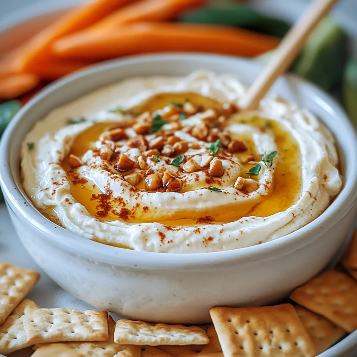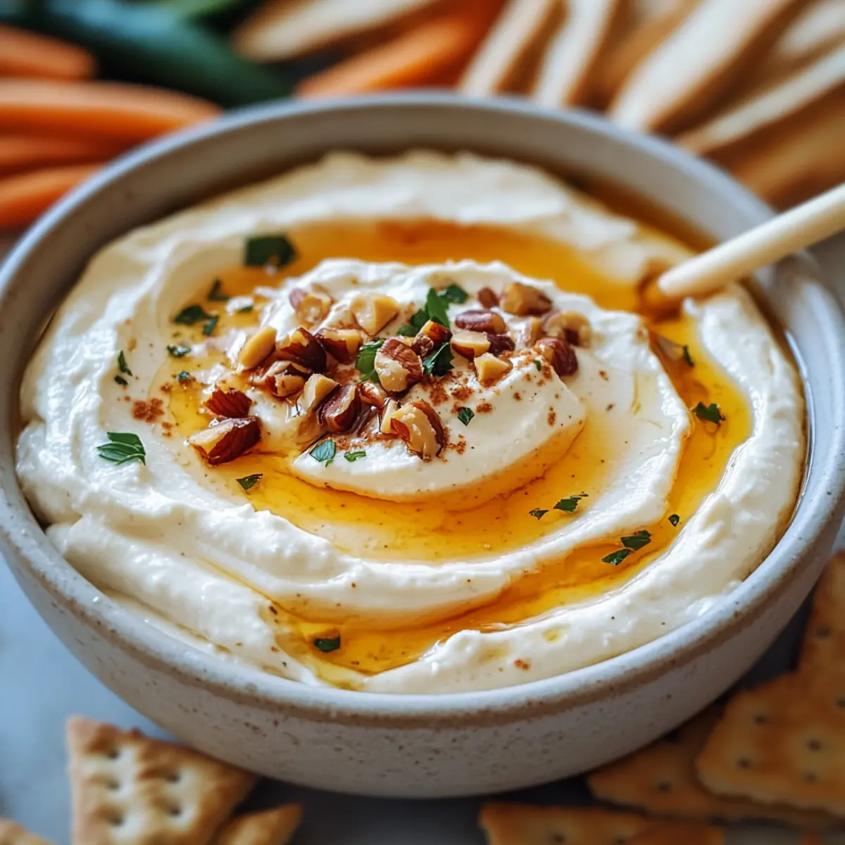 Crunchy Vegetable Sticks: Fresh carrot, cucumber, and celery sticks provide a crisp, refreshing contrast to the creamy dip. Their crunch will elevate each bite, bringing a garden-fresh touch.