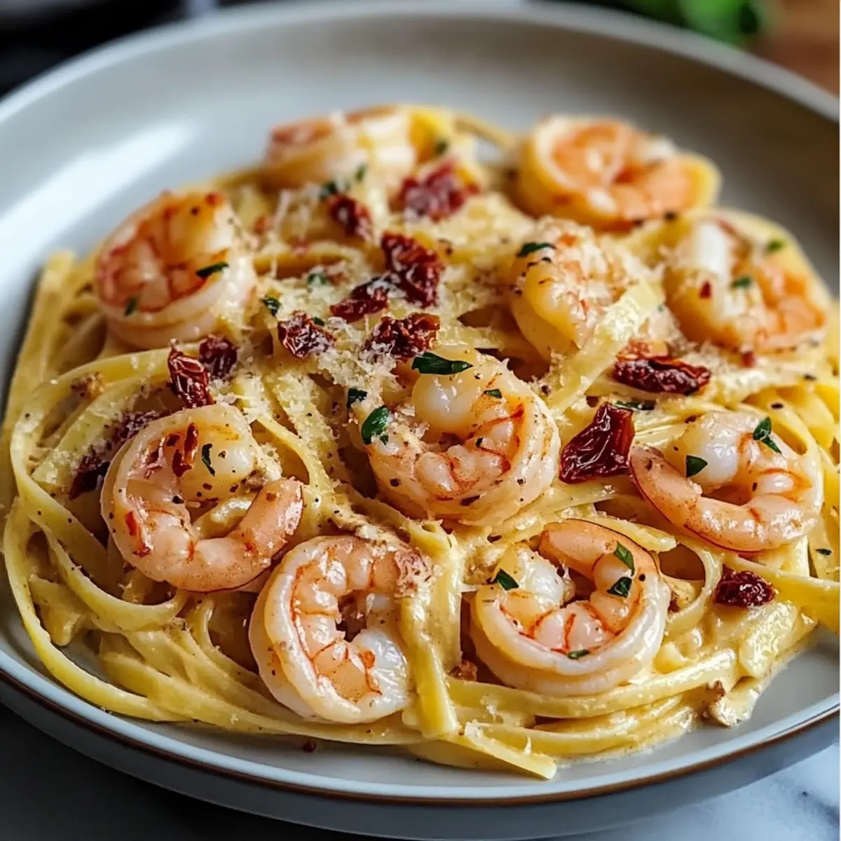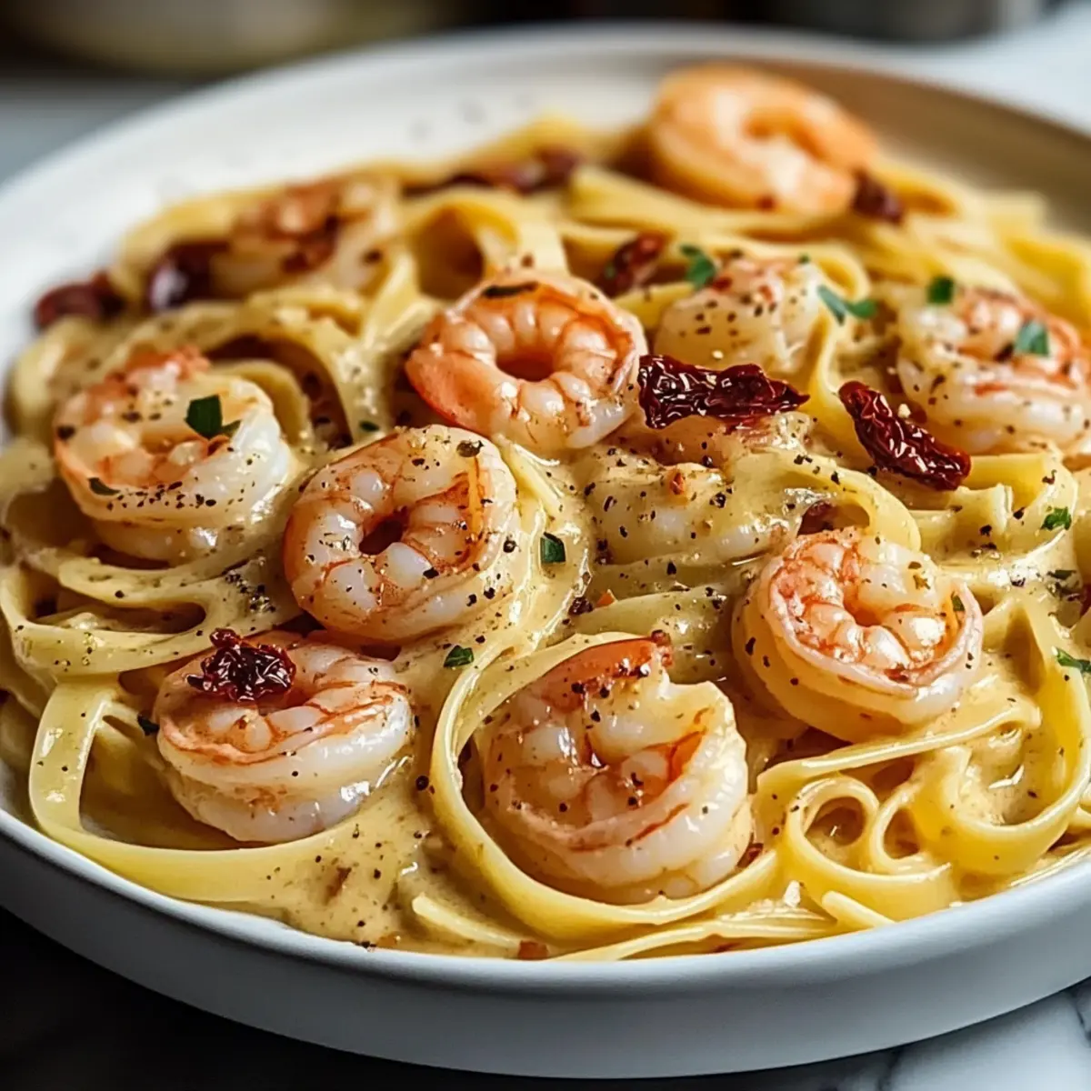 Velvety Richness: The creamy sauce envelops the fettuccine, while succulent shrimp and sun-dried tomatoes add the perfect punch of flavor.