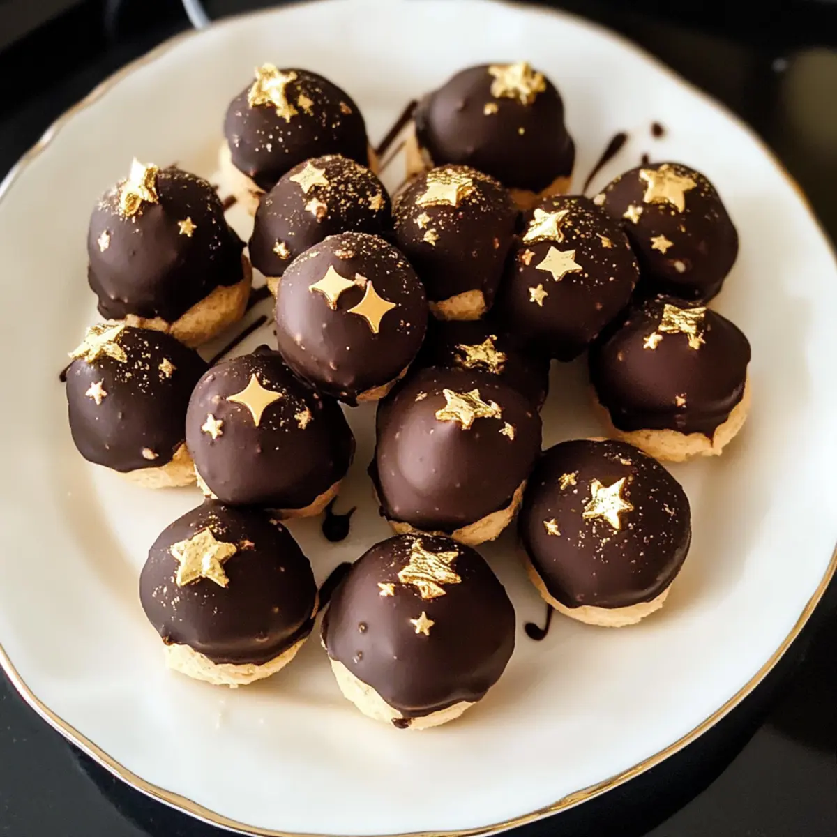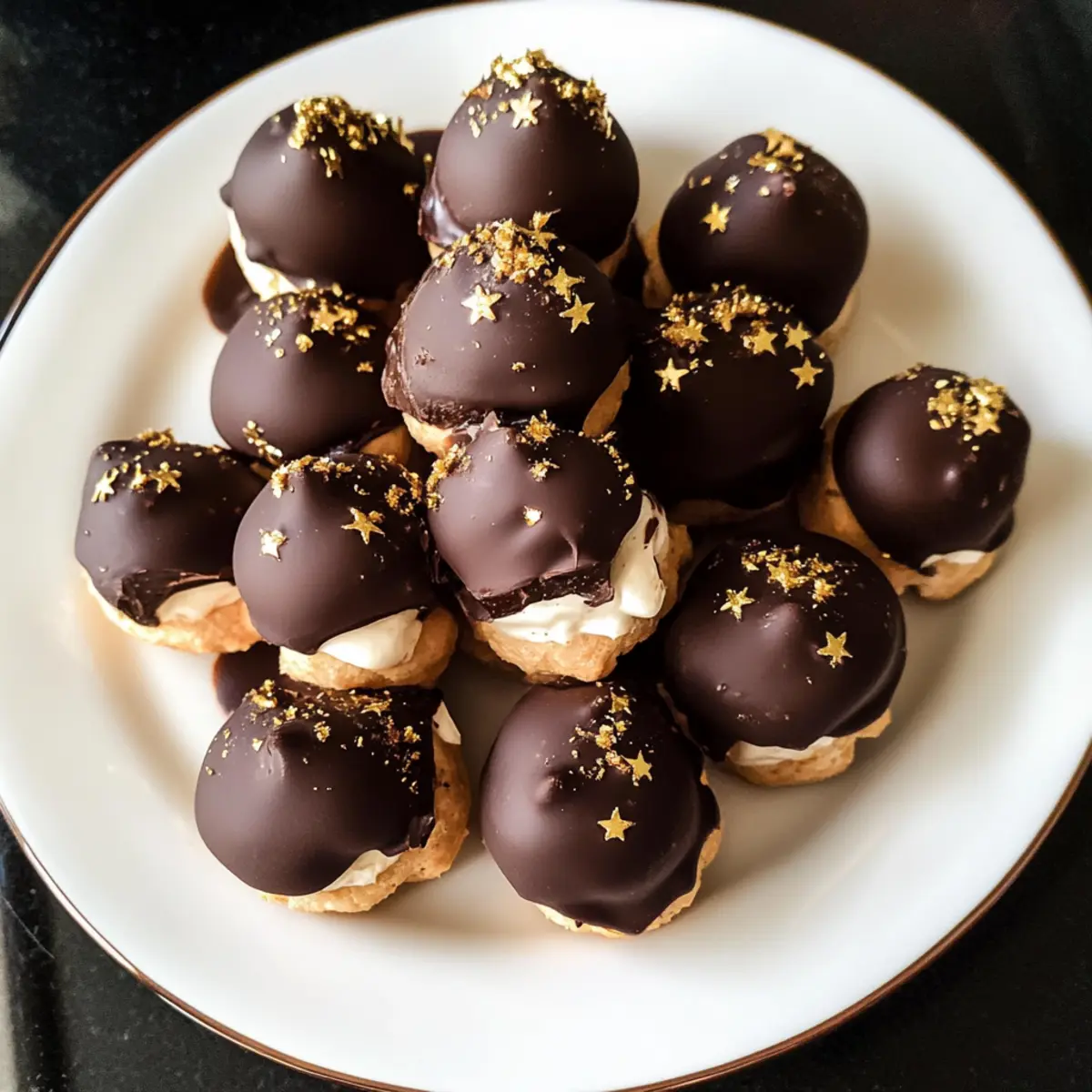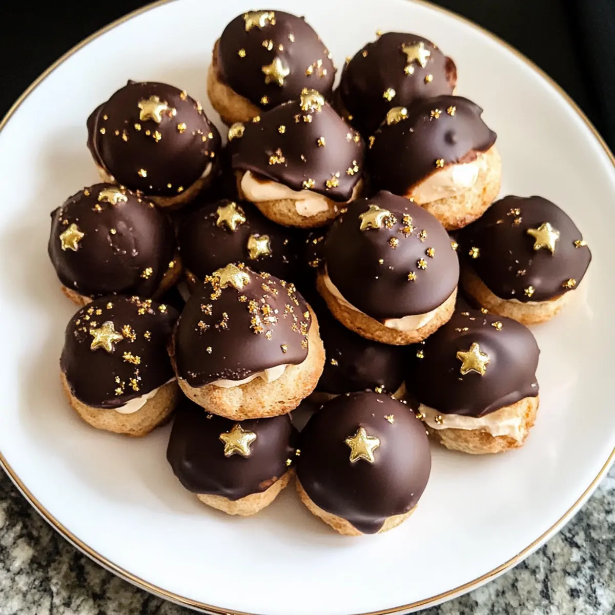 - Fill each cooled profiterole with espresso cream. Dip tops into melted chocolate. Sprinkle with gold star sprinkles if desired before serving.