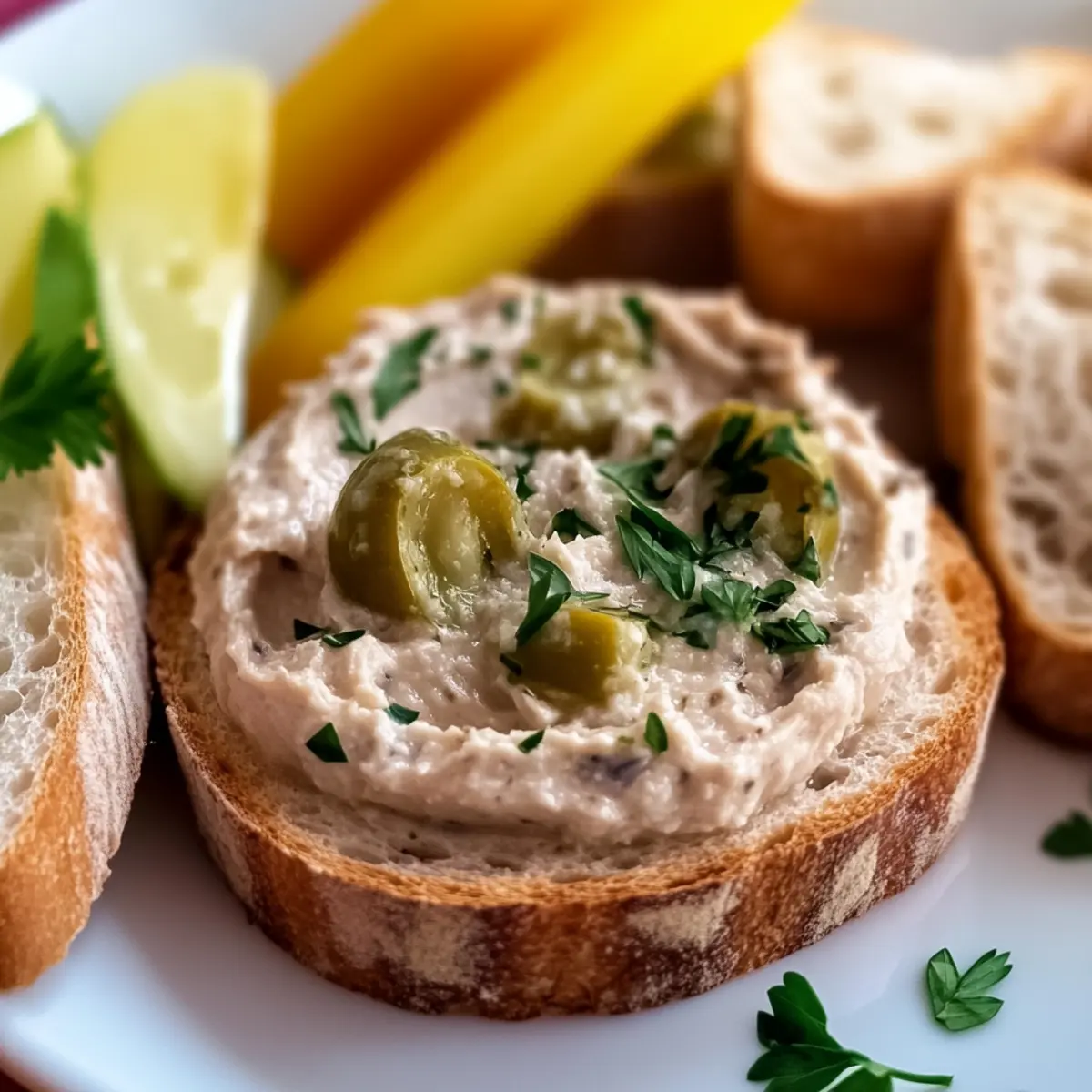 Toasted Baguette Slices: The warm, crunchy bread provides the perfect base for the creamy pâté, enhancing its rich flavor.