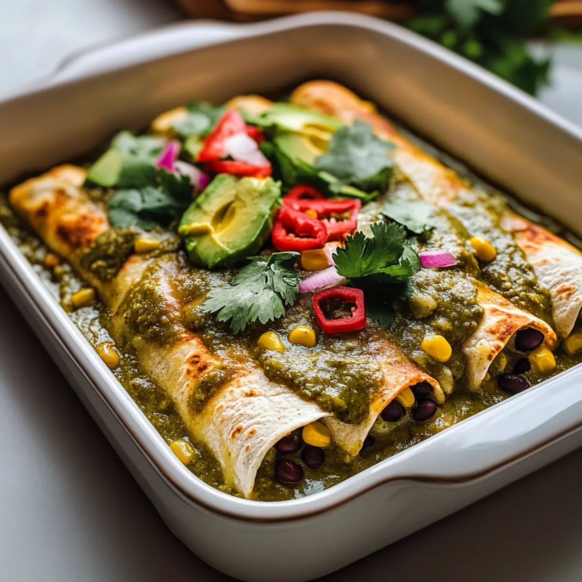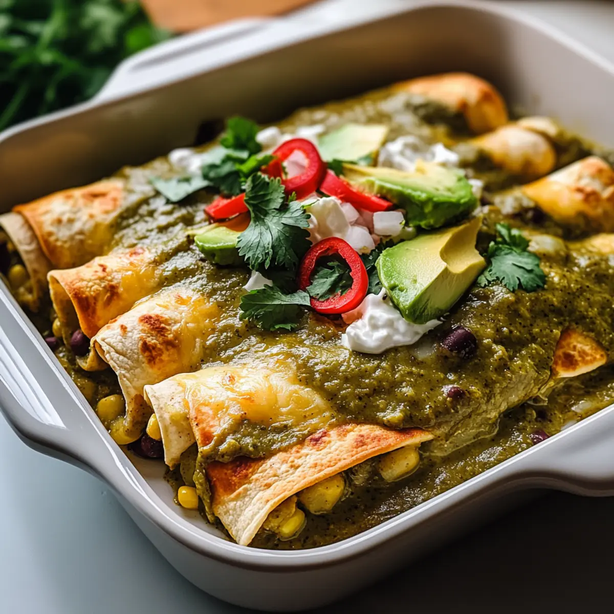 Once baked, let the Plant-based Potato Green Chili Enchiladas cool slightly before serving. This allows flavors to settle and makes them easier to enjoy. If desired, sprinkle fresh cilantro on top and serve with sliced avocado for an extra touch of creaminess. Each bite will be a comforting hug of flavors and textures!