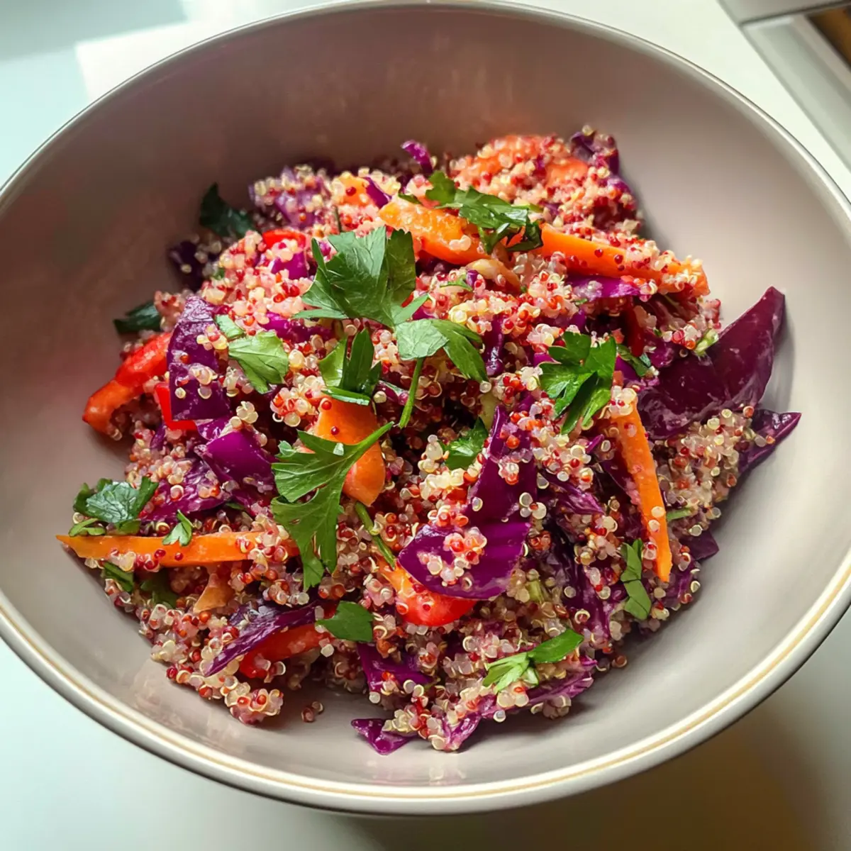 Vibrant, this Quinoa and Red Cabbage Salad not only dazzles your eyes but also delights your taste buds. Nutrient-packed, quinoa provides a complete protein while the cabbage offers a crunch filled with antioxidants. Versatile, you can mix and match ingredients, swapping in seasonal veggies. Meal-prep friendly, it lasts up to three days in the fridge, making healthy eating effortless. Flavorful, the tangy dressing binds it all together, ensuring every bite is a refreshing treat. Plus, it’s an excellent side for your favorite grilled proteins or a colorful addition to any buffet spread!