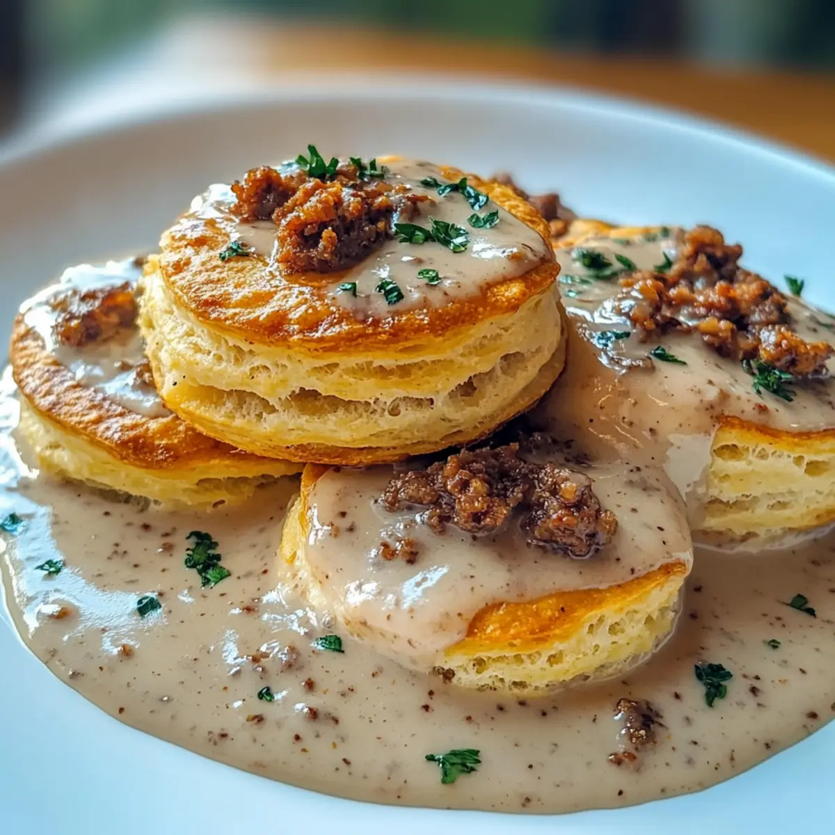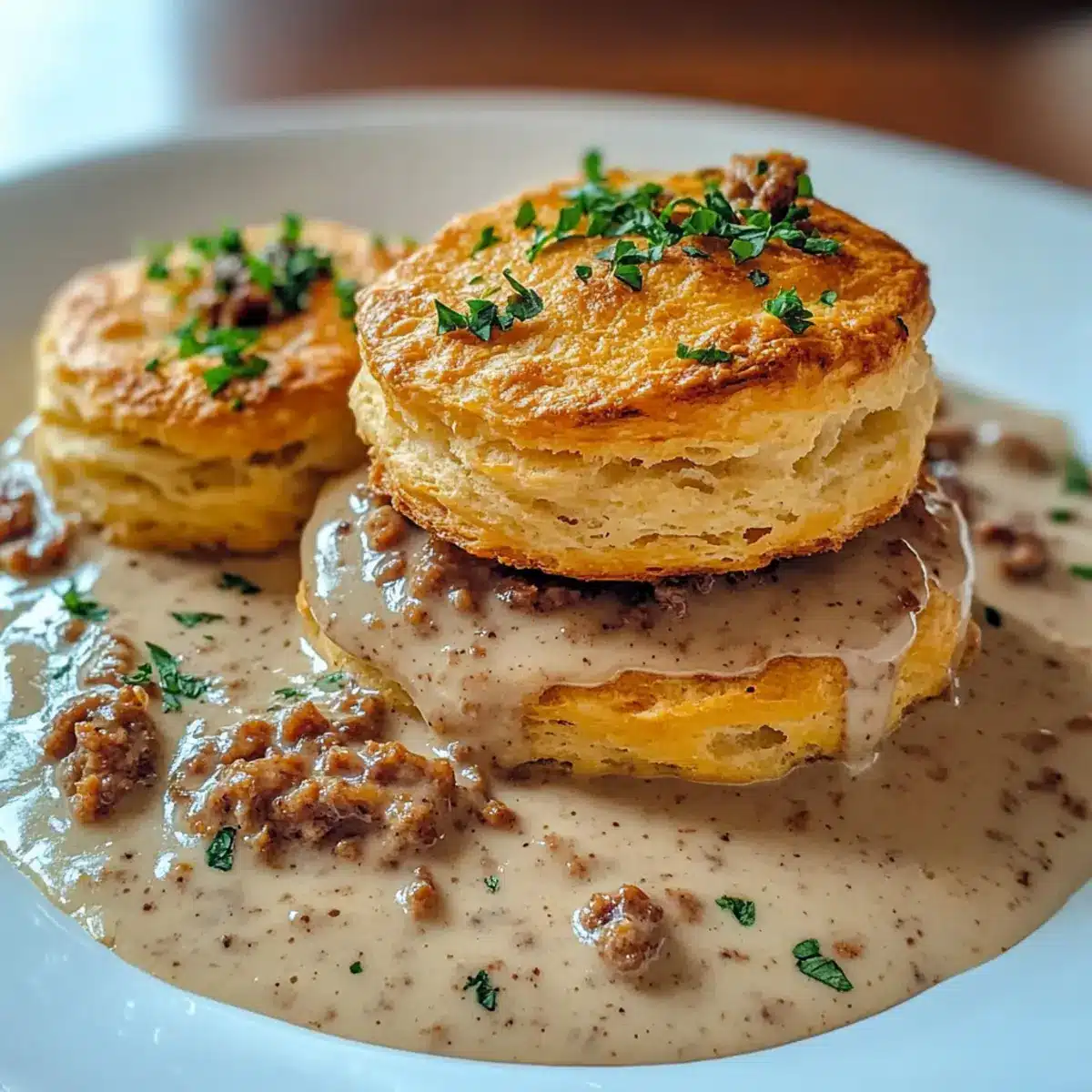 Hearty Comfort: Flaky biscuits topped with rich, spicy gravy deliver the warmth and satisfaction of traditional Southern cuisine.
