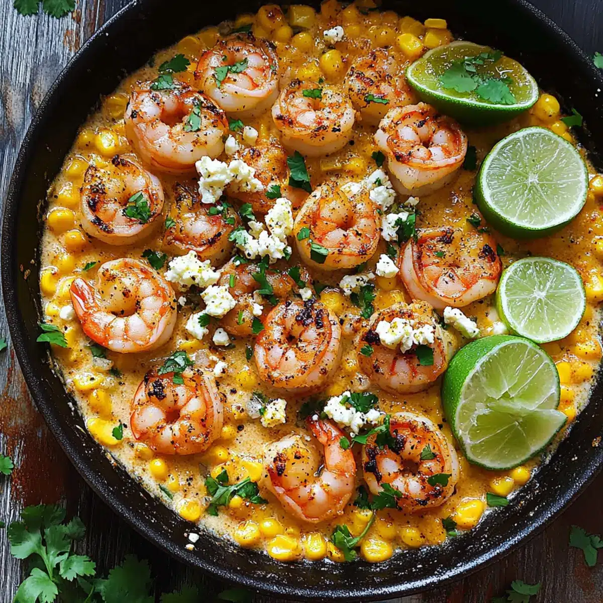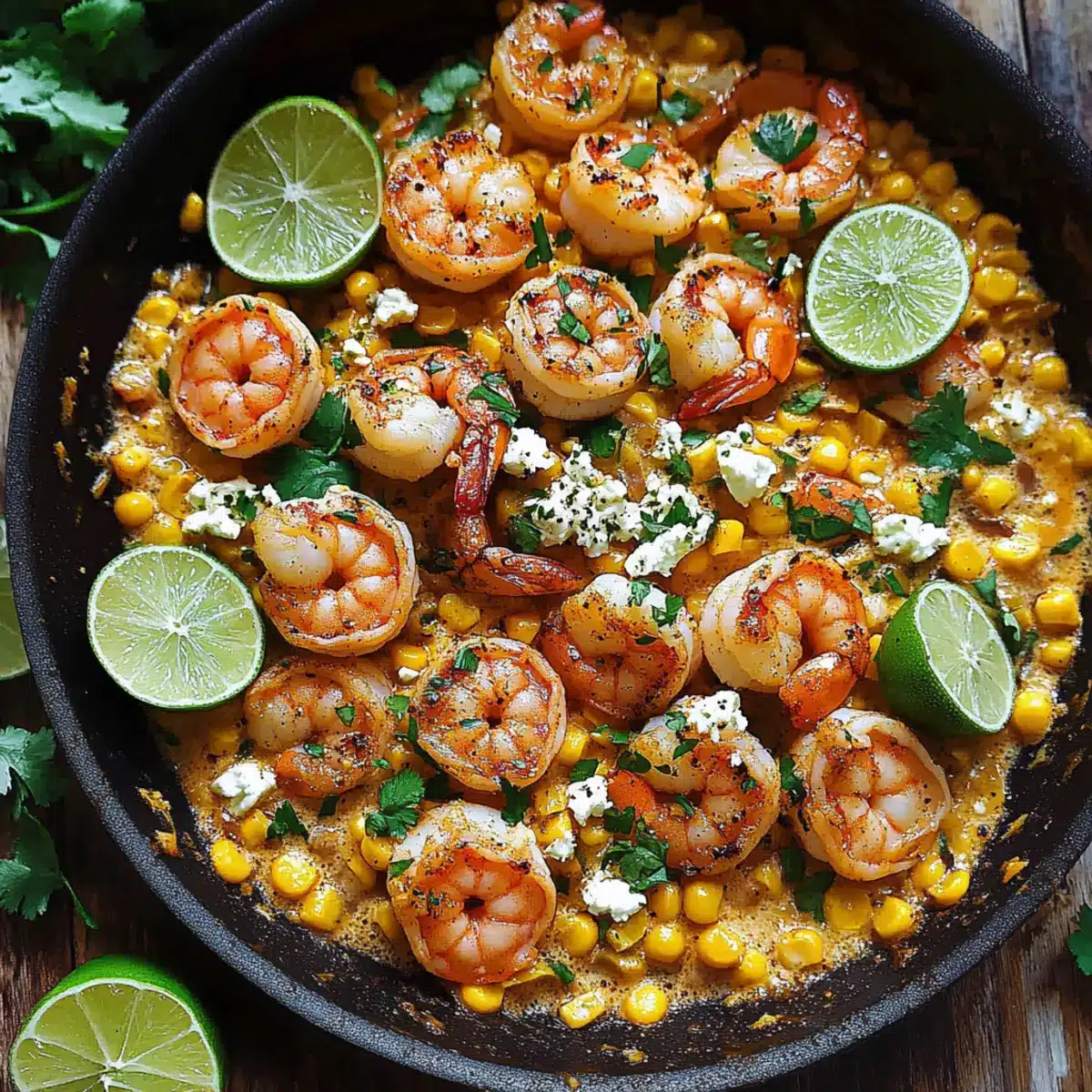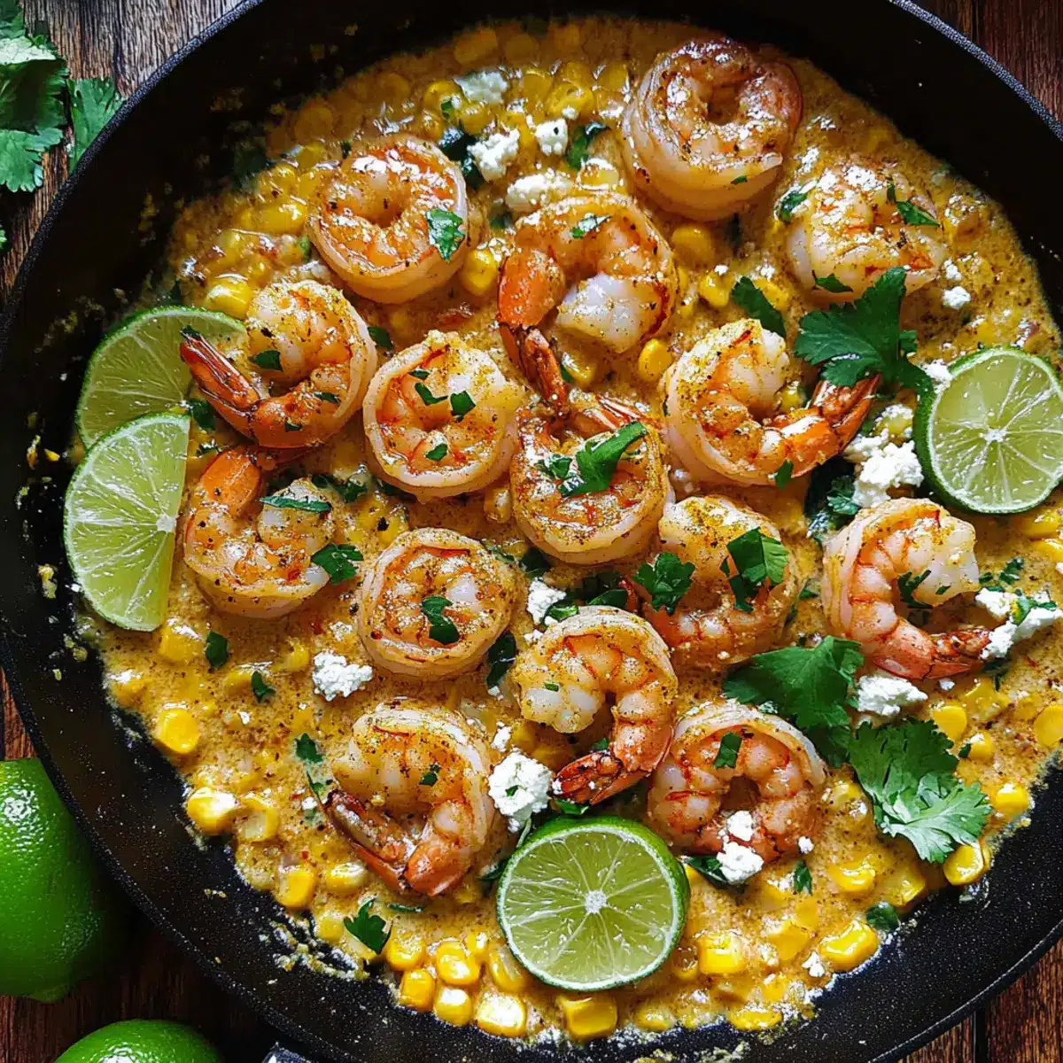 Finish off your Shrimp and Creamed Corn by squeezing the juice of 2 small limes into the creamy sauce, giving it a refreshing zing. Return the cooked shrimp to the skillet, ensuring they get reheated for about 2 minutes. For a polished presentation, top with the remaining corn, lime slices, and freshly chopped cilantro before serving. Adjust seasoning for taste, adding more chili powder if desired.