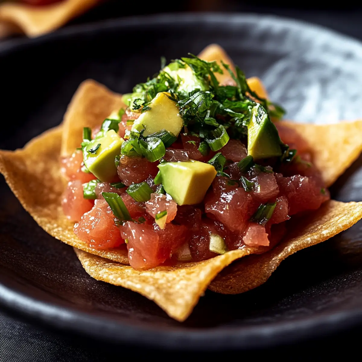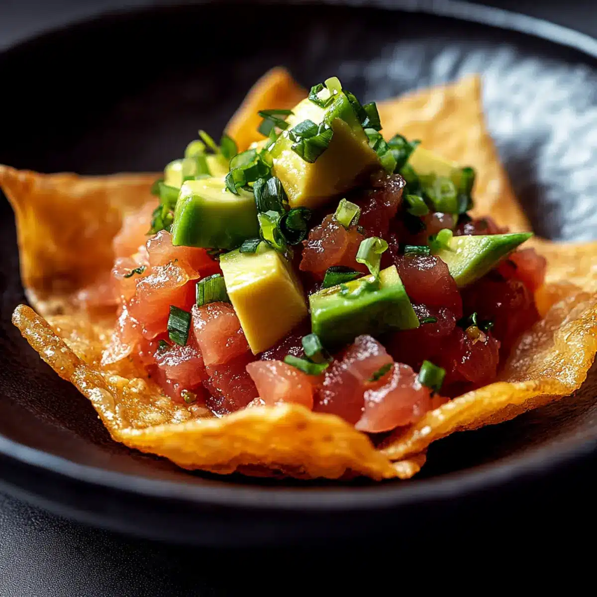 - Assemble by placing crispy wonton chips on a platter and topping each with spicy tuna mixture and diced avocado.