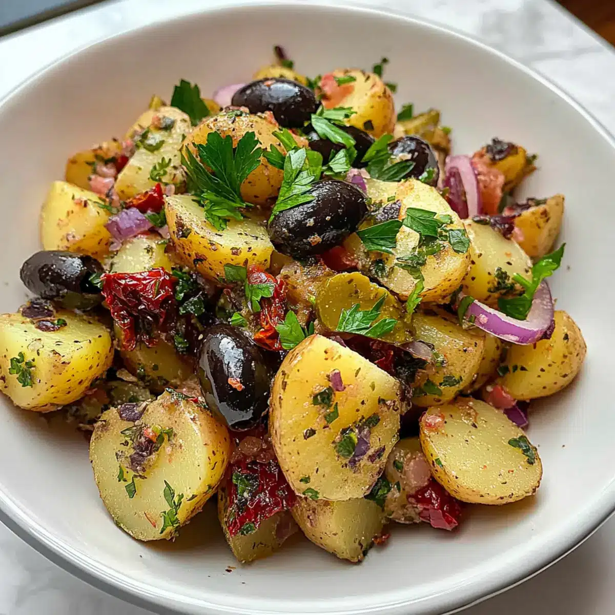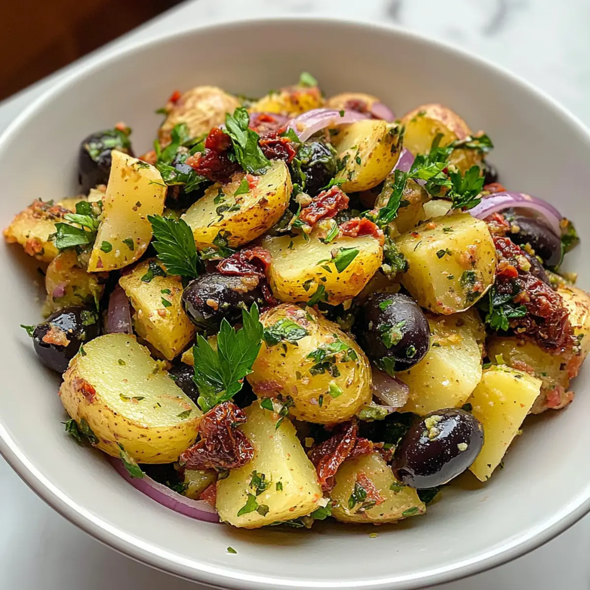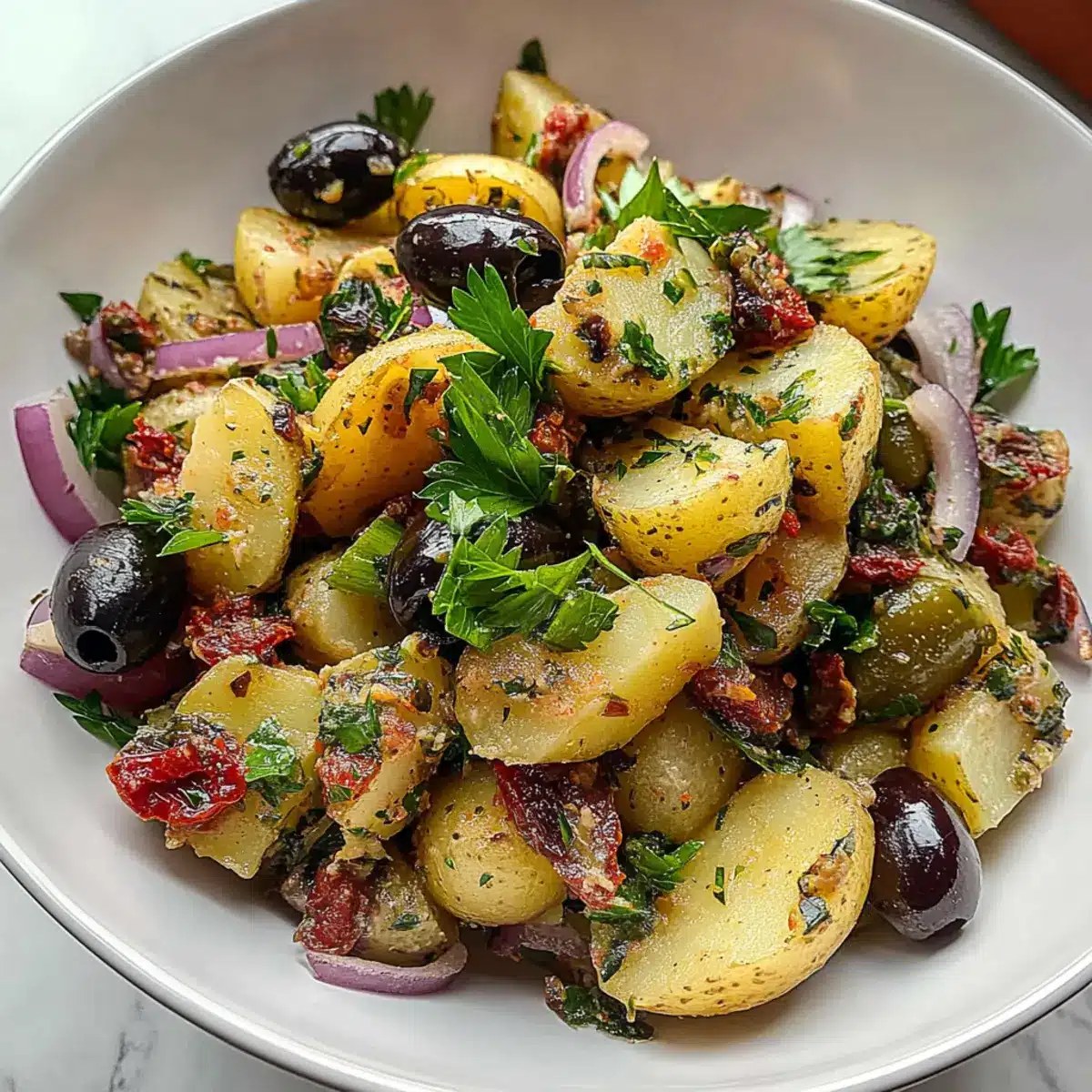 - Combine Salad Ingredients: In a large bowl, combine the chopped potatoes, diced red onion, parsley, dill pickles, black olives, capers, and sun-dried tomatoes. Gently mix.