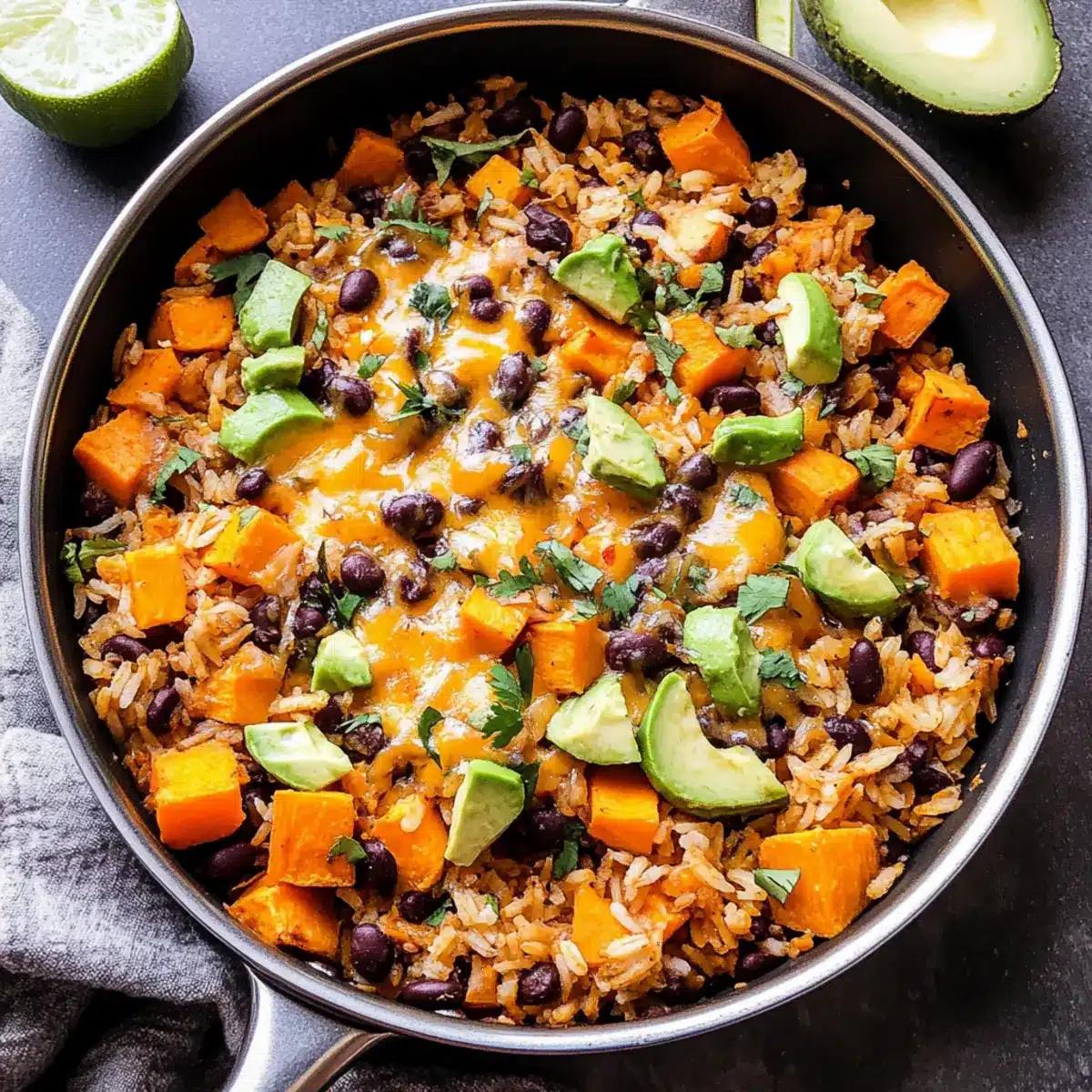 Preparing the Southwest Sweet Potato, Black Bean, and Rice Skillet ahead of time is a fantastic time saver for busy home cooks! You can chop the sweet potatoes and store them in an airtight container with a bit of water to prevent browning for up to 24 hours in the refrigerator. Additionally, you can prepare the spice mix and cook the brown rice a day in advance. To maintain quality, keep the cooked rice and sweet potato mixture separate until you’re ready to heat and combine everything. When it’s time for dinner, simply sauté the sweet potatoes, mix in the black beans, rice, and seasonings, and finish by melting the cheese on top for a delicious one-pan meal that’s just as vibrant and comforting as when freshly made!